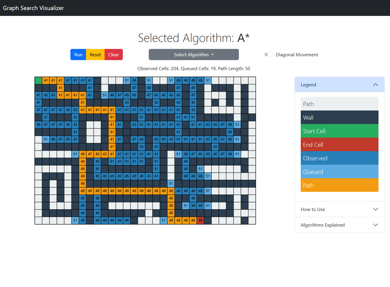 - A*: chooses the node with the lowest total cost (f-cost = g-cost + h-cost), combining distance traveled and estimated distance to the goal.